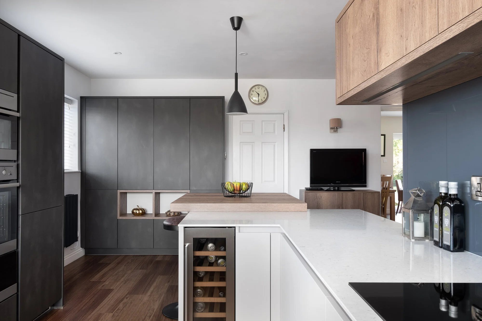 The clients were keen to retain a peninsular in their new kitchen along with a cosy sofa area where they could relax and watch TV. The space was reconfigured to incorporate a wooden breakfast bar juxtaposed with a smooth 12mm Silestone worktop. The far end of the kitchen also features a run of tall cabinets with display niches that provide additional storage. The furniture flows through into a separate lounge area where we created a unique area to house the television and wood-burning stove. This was achieved by combining wood panelling, Dekton cladding and abstract cabinetry.
