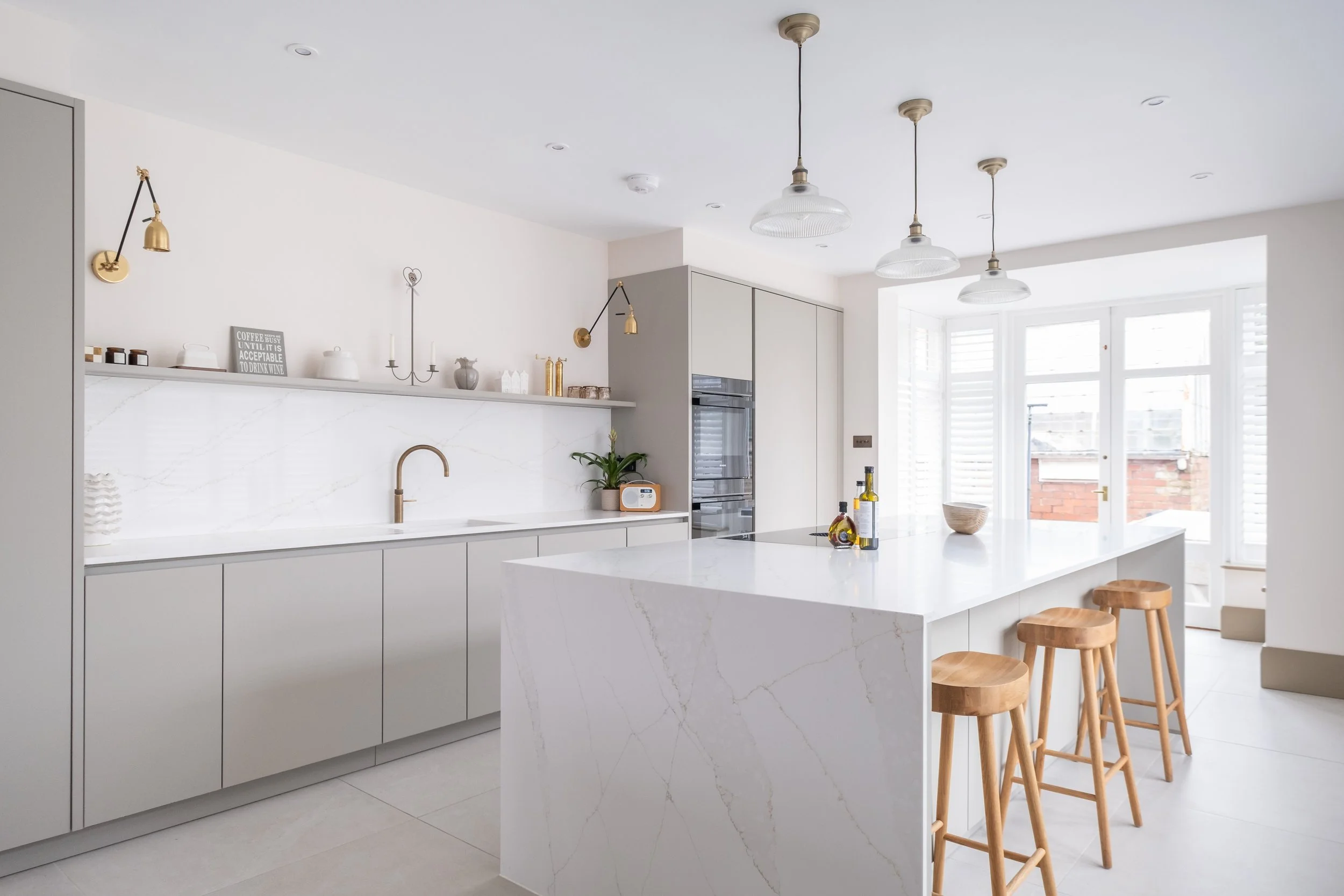 Handleless cabinetry in a soft neutral tone creates a seamless aesthetic, complemented by a full-height quartz splashback for visual continuity. Integrated appliances maintain clean sightlines, while brass accents — including the tap and wall lighting — introduce warmth and subtle contrast.